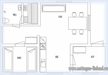 Площадь коттеджа 40кв.м. В доме небольшой холл, кухня с гостиной, спальня, смежные душ и туалет, а так же сауна.