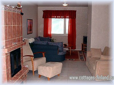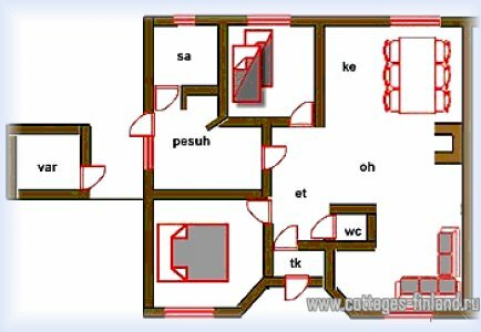 | В коттедже гостиная, объединенная с кухней, в гостиной софа, в доме так же 2 спальни, в каждой по оной двуспальной кровати. Электрическая сауна, ванная, туалет. |